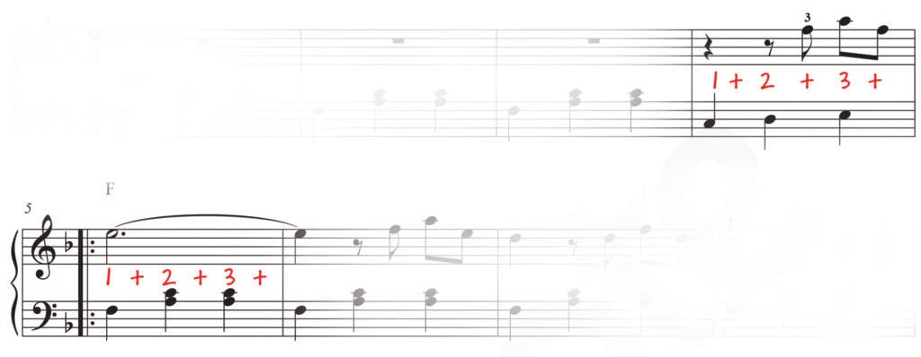 The right hand melody (main theme) starts on a few pick-up notes, which means we don’t begin on the on-beat. If it helps, break down the counting into eighth notes (1 + 2 + 3 + ) and write this down on the sheet music. You can even draw lines on the sheet music to match up the left and right hand parts.