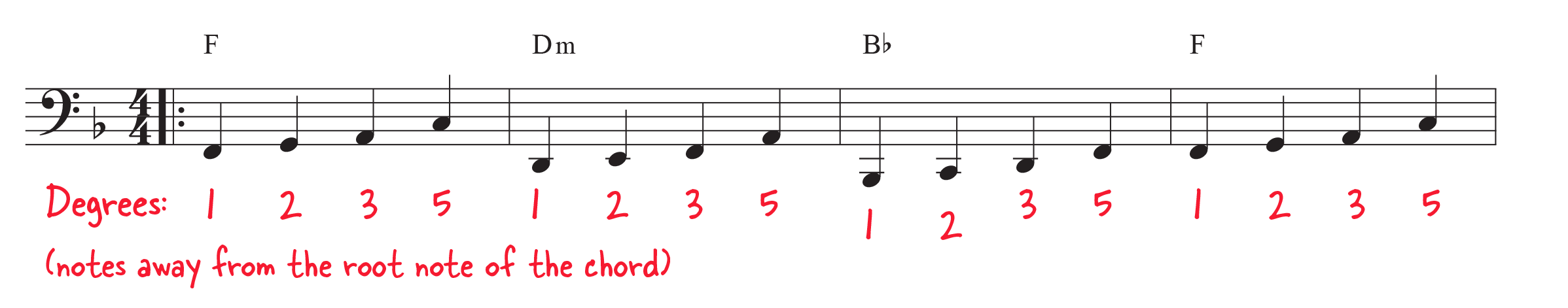 A walking bass on our left hand adds groovy forward momentum to our playing. When you’re bass walking, just remember this simple pattern: