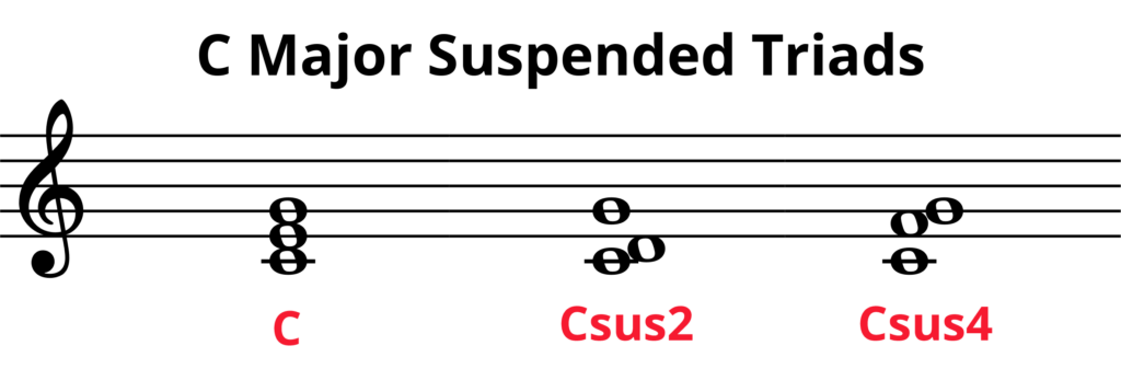 Another way to alter chords is by replacing them with suspended chords. Sus chords substitute the third of a chord with another note: a sus2 substitutes with a major 2nd while a sus4 substitutes with a perfect 4th. By removing the third, the listener is no longer certain whether a chord is major or minor (because it’s neither!). This gives suspended chords an ambiguous, intriguing sound.