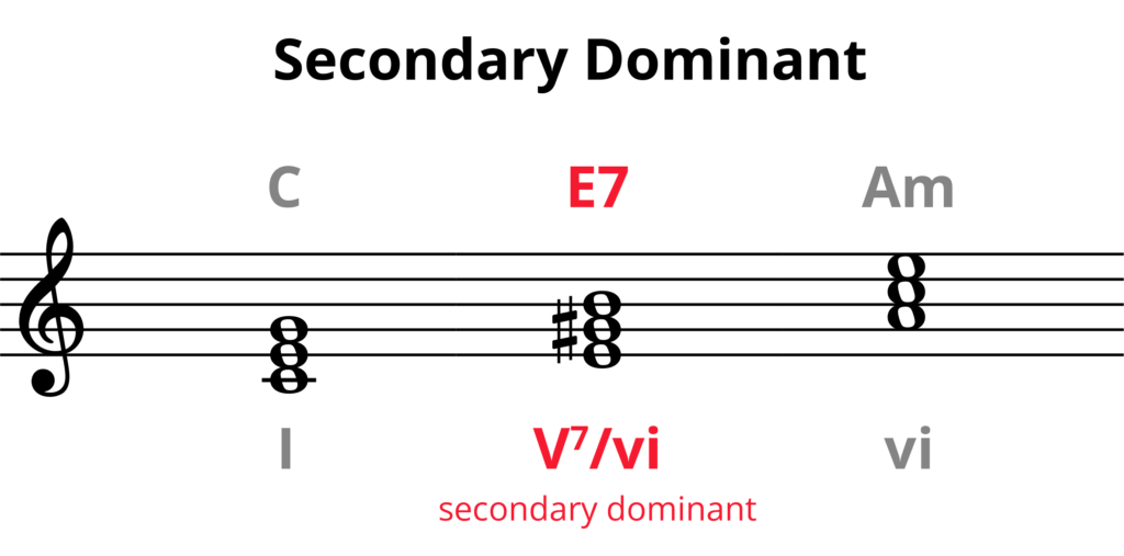 This technique is what gives RnB and gospel music their distinct sound and involves temporarily moving out of the current key between two chords. To do this, look at the chord you’re moving towards (Am in our example) and find the V7 of that key (A minor). You should get E7. You may see this concept notated as V7/vi. This can be read as “V7 of the vi.”