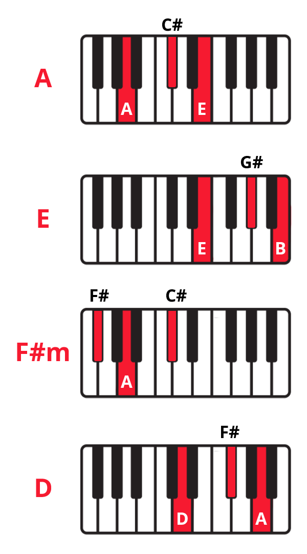 A – Root Position C#m – 2nd Inversion F#m – Root-Fifth-Root D – 2nd Inversion