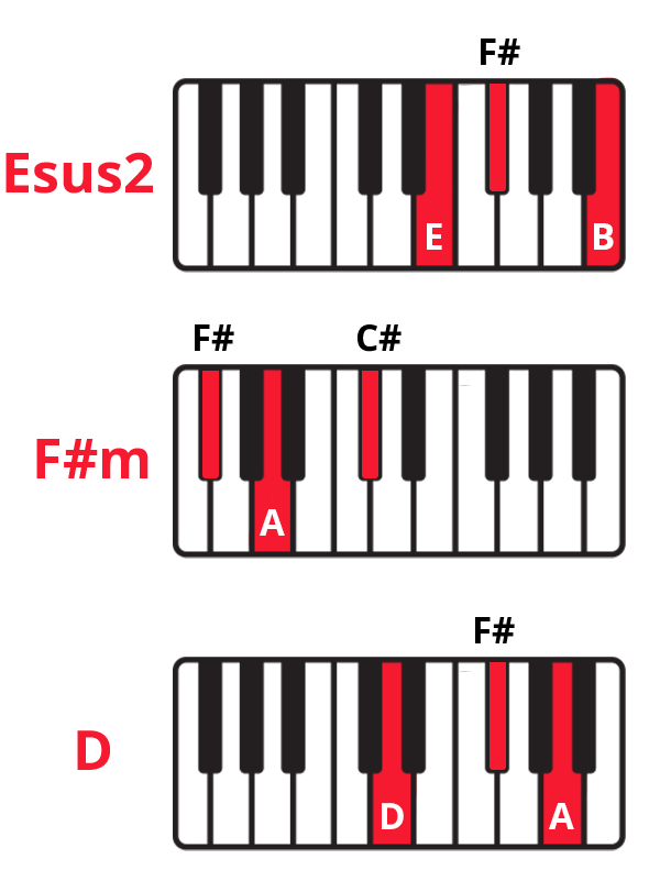 Esus2 can also be played as Eadd9, and F#m may be substituted with F#m7 for extra variety.