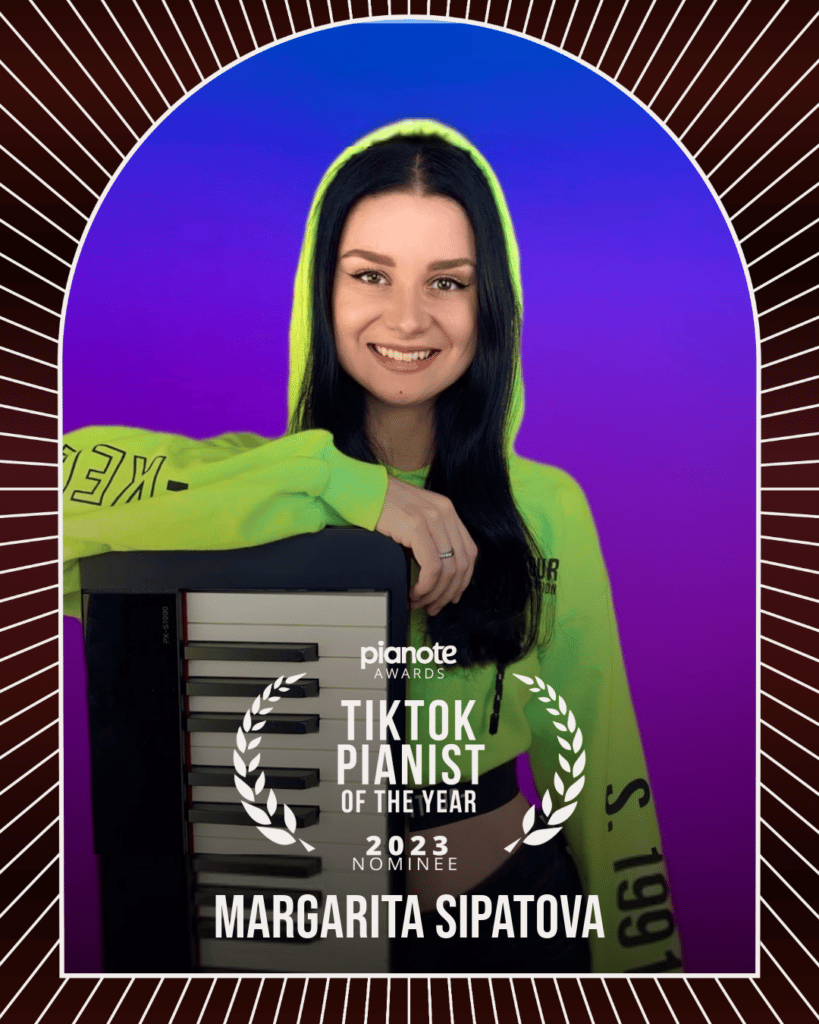 Margarita Sipatova has just under a million followers on TikTok. A classically trained pianist who performs covers and livestreams, the production value of her videos is uniquely high for a fast-paced social media platform. A consistent and prolific uploader, Sipatova had several million+ view videos in 2023. She is also an opera singer!
