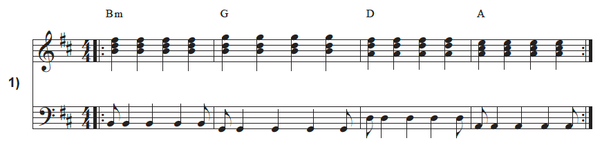 This is an expansion of Exercise # 1, and it helps to know that the right-hand stays exactly the same. There is no change. There is only a slight change to the left-hand rhythm in the middle of each measure. But the start and end of each bar are still the same: