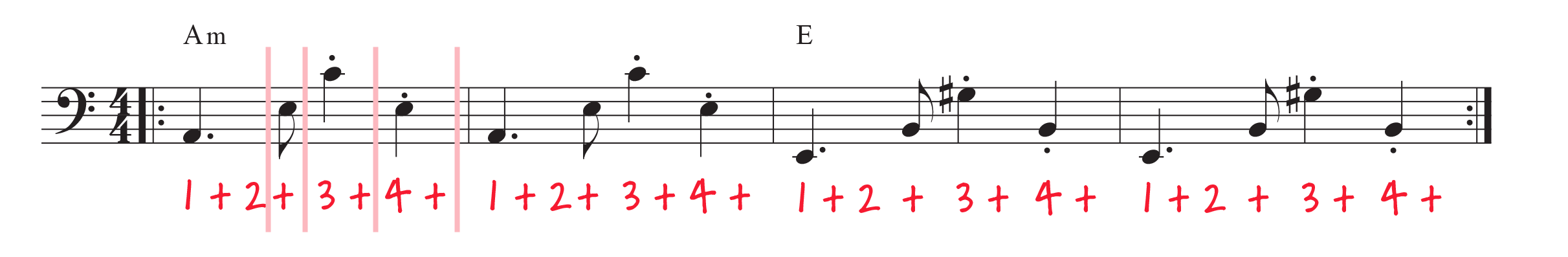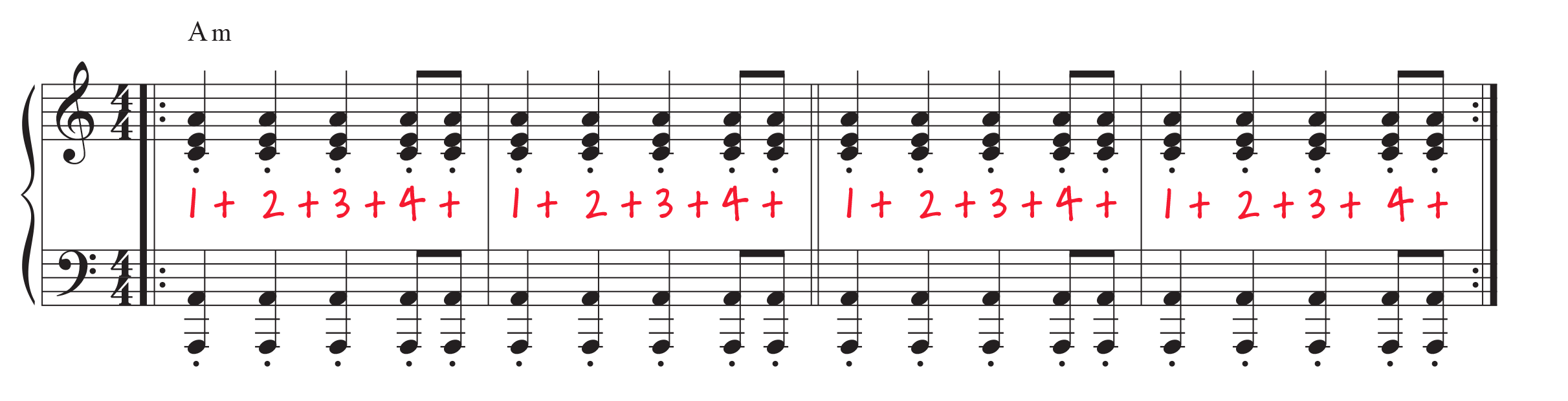 For this rhythm, we’ll outline a chord using octaves and fifths: