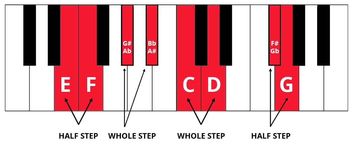 🎹 Whole Steps vs. Half Steps: Half steps are keys that are right next to each other on the piano. A whole step consists of two half-steps.